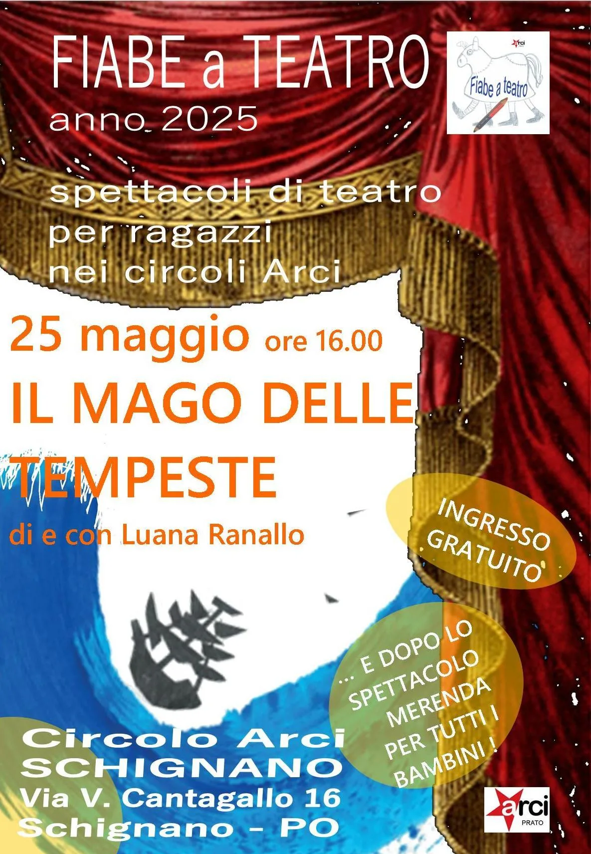 Domenica 25 maggio, alle 16:00, al Circolo Arci Schignano, per “Fiabe a teatro”, rassegna di teatro per bambini e famiglie, andrà in scena lo spettacolo “Il mago delle tempeste”, di e con Luana Ranallo, una storia di magia, mostri e spiriti su un’isola incantata, sotto il potere di un grande mago. Età consigliata 5-12 anni. Ingresso libero e, dopo lo spettacolo, merenda per tutti