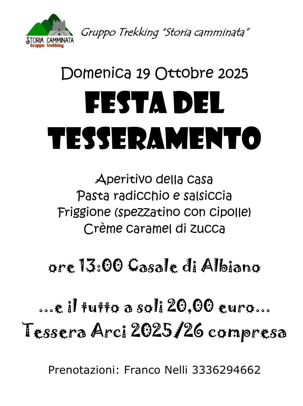 Il Gruppo trekking Storia Camminata di Montemurlo organizza per domenica 19 ottobre al Casale di Albiano la Festa del tesseramento: 20 € pranzo e nuova tessera Arci. per info e prenotazioni tel 3336294662 (Franco)