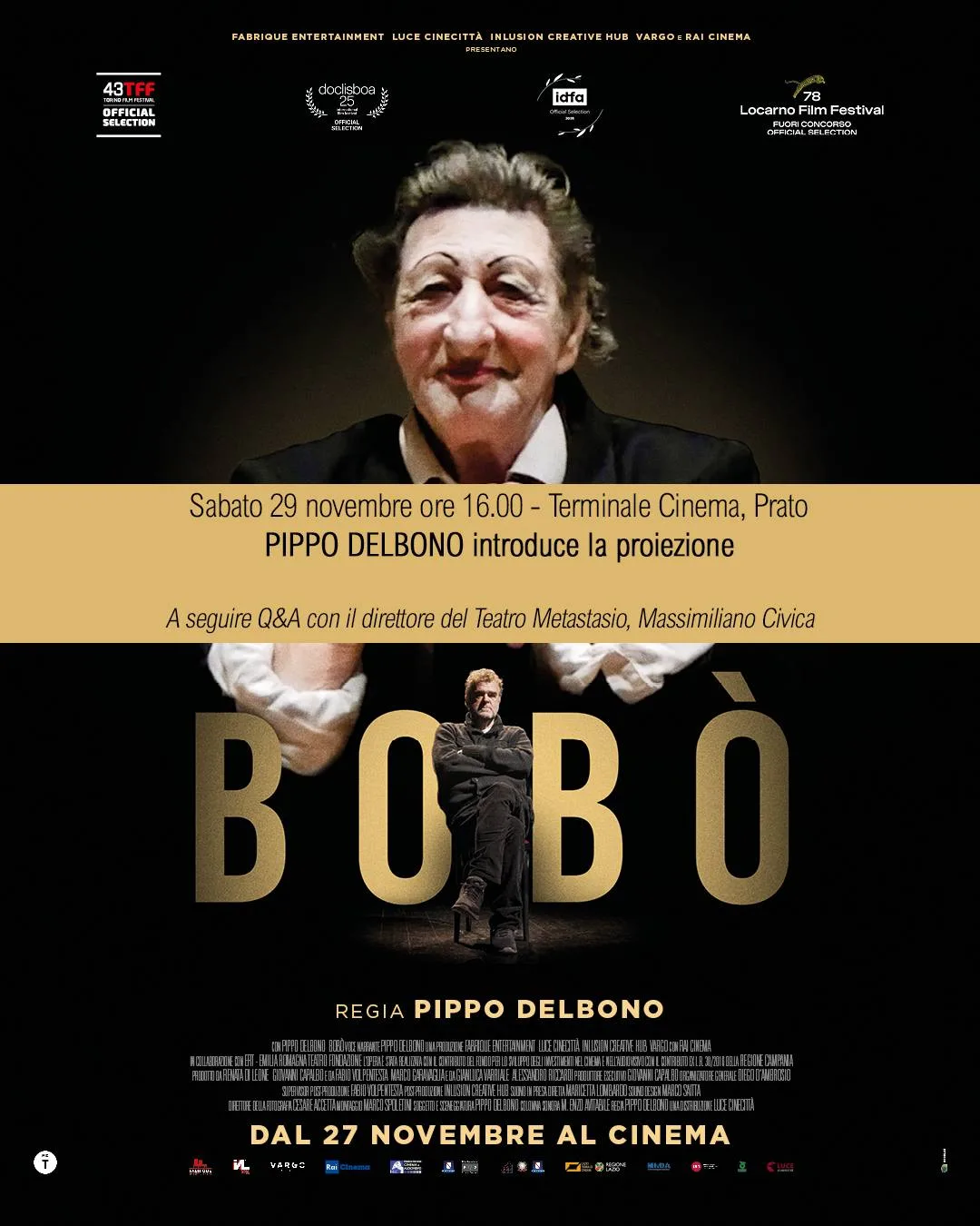 Pippo Delbono sarà a Prato, sabato 29 novembre, al Terminale Cinema, per presentare la sua ultima opera cinematografica, “Bobo’”, documentario dedicato a Vincenzo Cannavacciuolo, in arte Bobo’, anima muta e visibile del teatro contemporaneo, per oltre vent’anni figura centrale nell’opera di Delbono. (Di Pippo Delbono, doc. ita. 2025, durata 81’). Dialoga con il regista, il direttore del Teatro Metastasio, Massimiliano Civica. Ingresso ridotto abbonati Met.