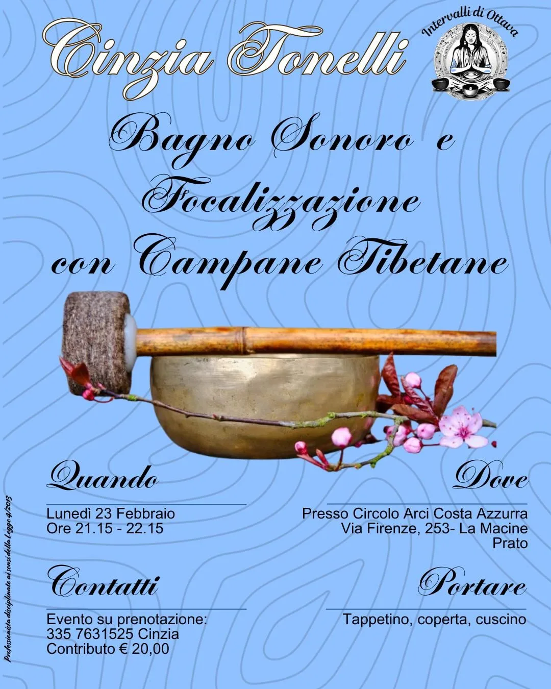 Lunedì 23 febbraio, al Circolo Arci “Costa Azzurra” a La Macine (Prato), “Bagno sonoro e focalizzazione con campane tibetane” a cura di Cinzia Tonelli. Per info e prenotazioni 335 7631525.