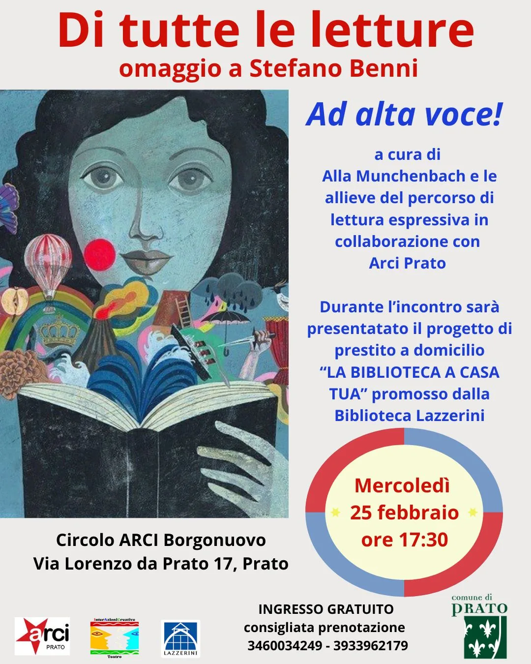 Mercoledì 25 febbraio , alle 17:30 al Circolo Arci Borgonuovo (Via Lorenzo da Prato 17, Prato), letture drammatizzate a cura di Alla Munchenbach e delle allieve del percorso di lettura espressiva “Ad Alta Voce!”. Durante l’iniziativa verrà presentato il progetto di prestito a domicilio “La Biblioteca a Casa tua” promosso dalla Biblioteca Lazzerini in collaborazione con Arci Prato. Ingresso gratuito, consigliata prenotazione ai numeri 3460034249, 3933962179.