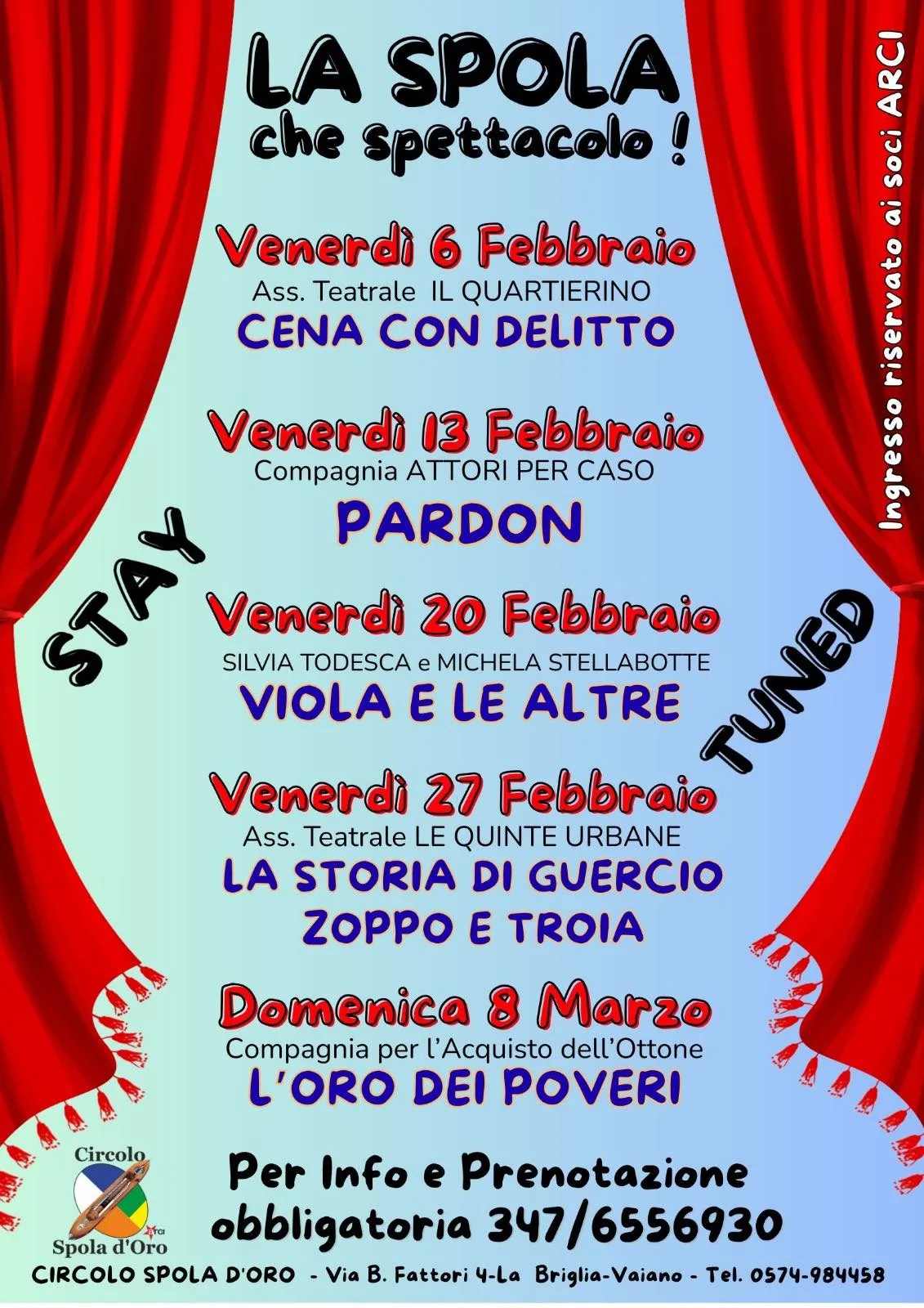 Prende il via venerdì 6 febbraio al Circolo Arci “Spola d’Oro” a La Briglia (Vaiano, PO), la rassegna teatrale “La spola che spettacolo!”. Cinque appuntamenti con lo spettacolo dal vivo per divertirsi e non solo. Il programma…