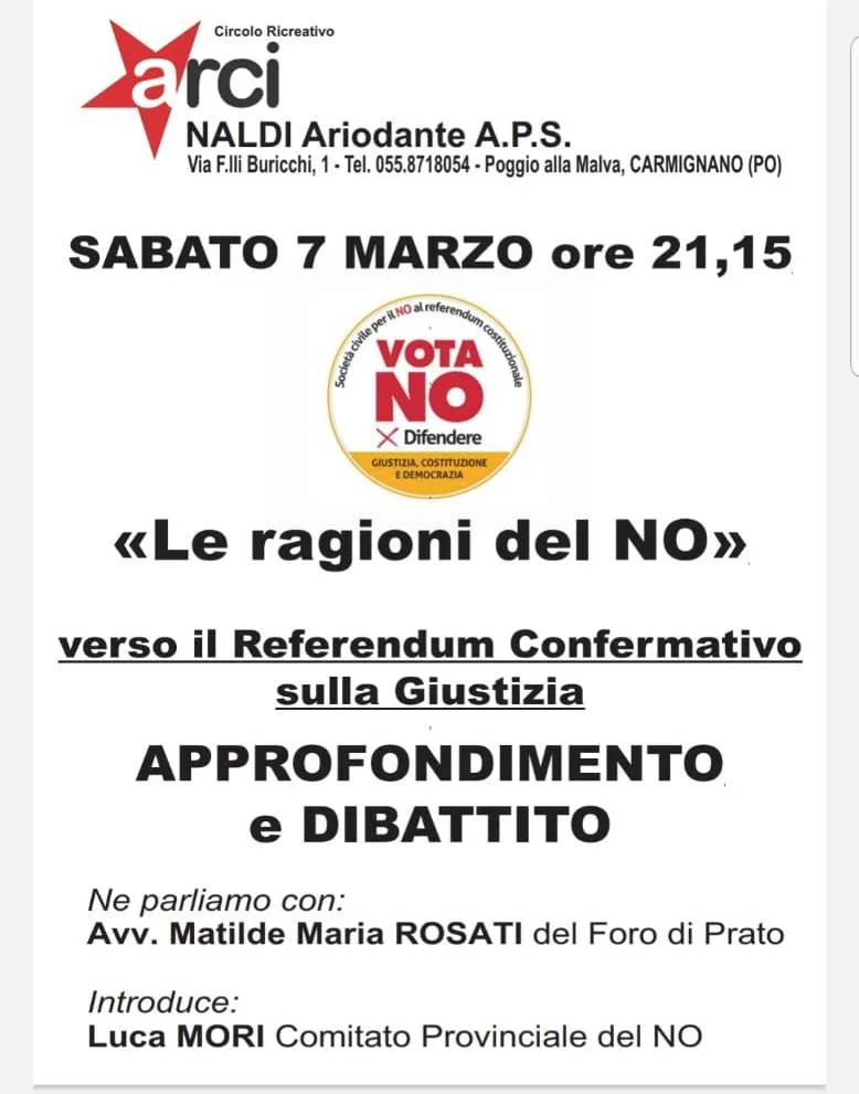 Al referendum costituzionale del 22 e 23 marzo, l’Arci vota no! Tre appuntamenti sul territorio per capire le ragioni: sabato 28 febbraio al Circolo “Costa Azzurra” a La Macine, martedì 3 marzo al Circolo “La Libertà del 1945” a Viaccia, sabato 7 marzo al Circolo “A. Naldi” a Poggio alla Malva.