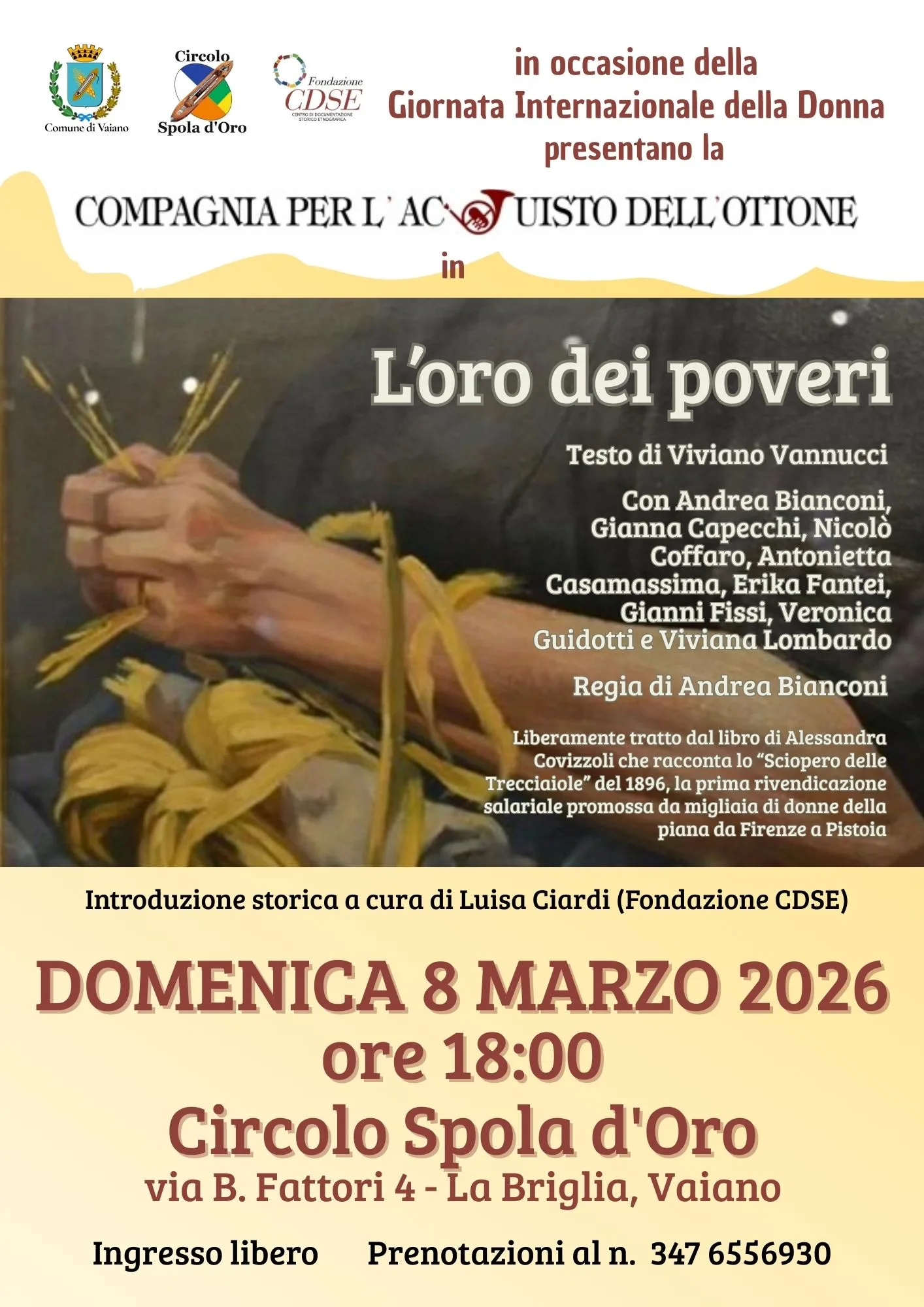 Domenica 8 marzo al Circolo Arci “Spola d’oro” a La Briglia (Vaiano), l’ultimo appuntamento della rassegna “La spola che spettacolo!” è con “L’oro dei poveri” della Compagnia Ottone Teatro, che racconta lo sciopero delle trecciaiole della Piana Fiorentina alla fine dell’800, il primo in Italia organizzato da donne. Lo spettacolo sarà preceduto da un’introduzione di Luisa Ciardi del CDSE. Ingresso libero.
