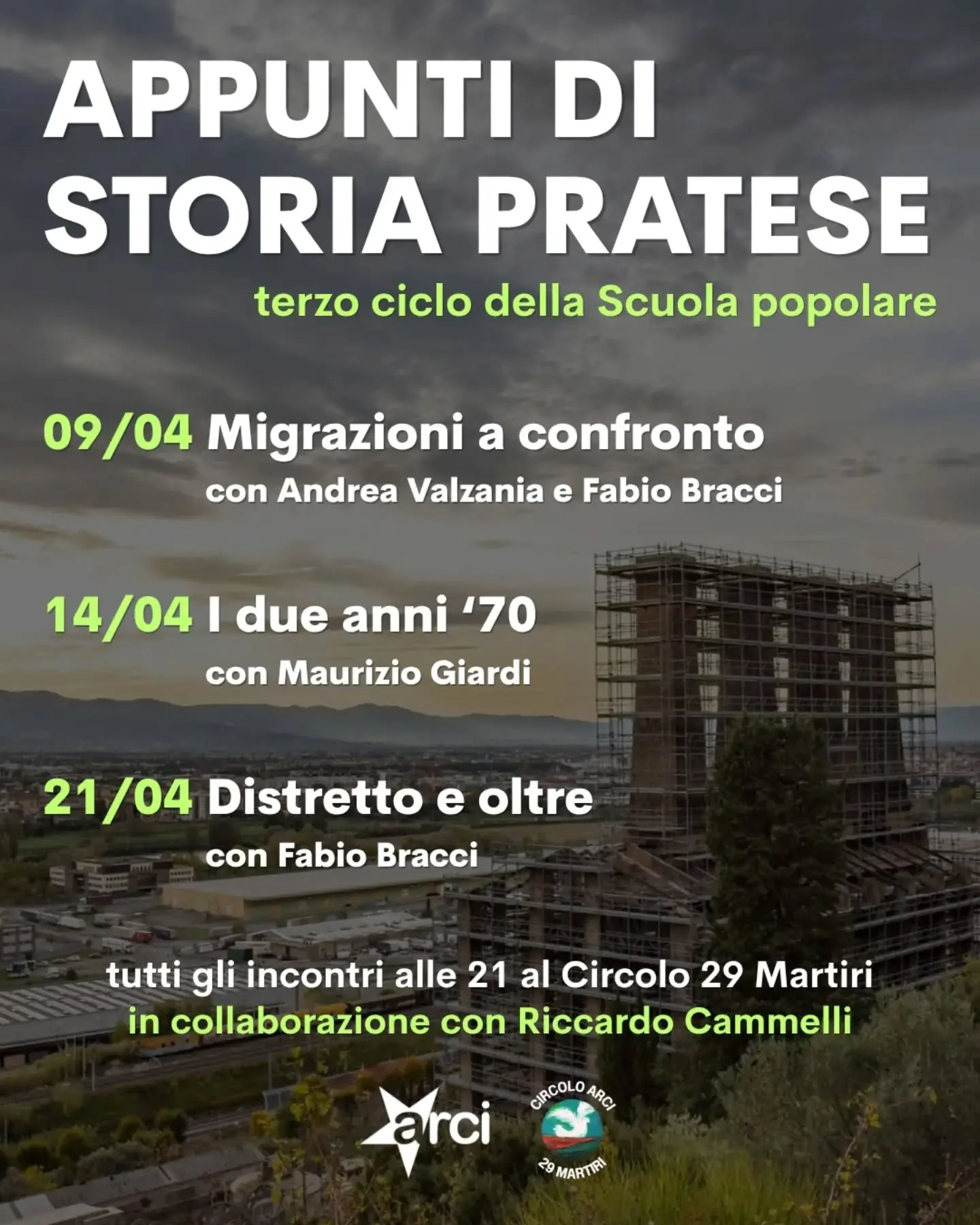 Alla Scuola Popolare di Figline il mese di aprile è dedicato alla storia della nostra città, con tre appuntamenti, giovedì 9 si parlerà di migrazioni con Andrea Valzania e Fabio Bracci, martedì 14 di anni ’70 con Maurizio Giardi e martedì 21 di Distretto con Fabio Bracci. Tutti gli appuntamenti sono al Circolo 29 Martiri