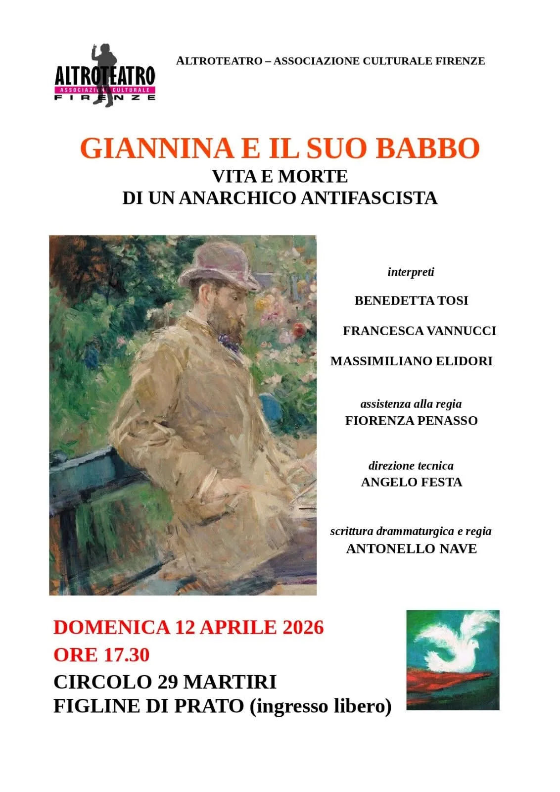 Domenica 12 aprile alle 17.45 al Circolo Arci “29 Martiri” a Figline di Prato, Altroteatro presenta lo spettacolo “Giannina e suo babbo, vita e morte di un anarchico Antifascista“, un omaggio alla figura di Giuseppe Manzini nel centenario della sua morte avvenuta a causa di un’aggressione fascista nel 1925 a Cutigliano. Ingresso libero