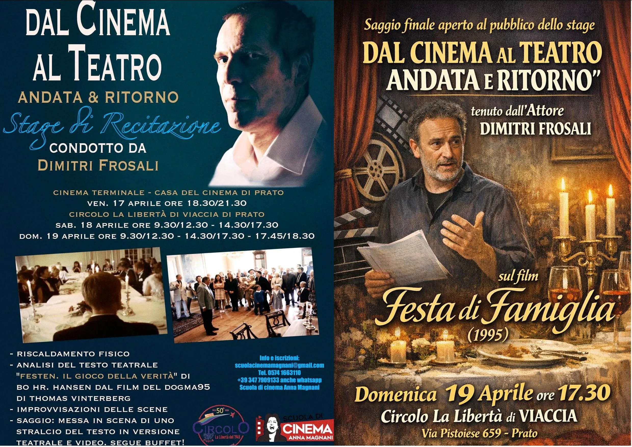 Venerdì 17 e sabato 18 aprile si svolge a Prato lo stage di recitazione condotto da Dimitri Frosali organizzato dalla Scuola di Cinema “Anna Magnani”. Lo stage si svolgerà venerdì al Terminale Cinema e sabato al Circolo Arci “La LIbertà del 1945” a Viaccia. Domenica 19, alle 17:30, al Circolo di Viaccia, si terrà il saggio finale aperto al pubblico. Ingresso libero